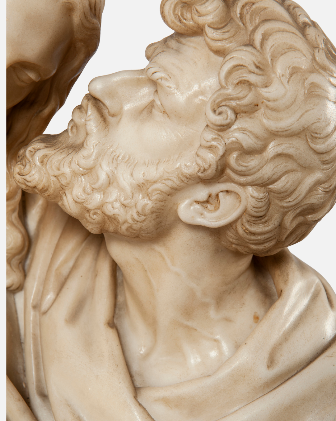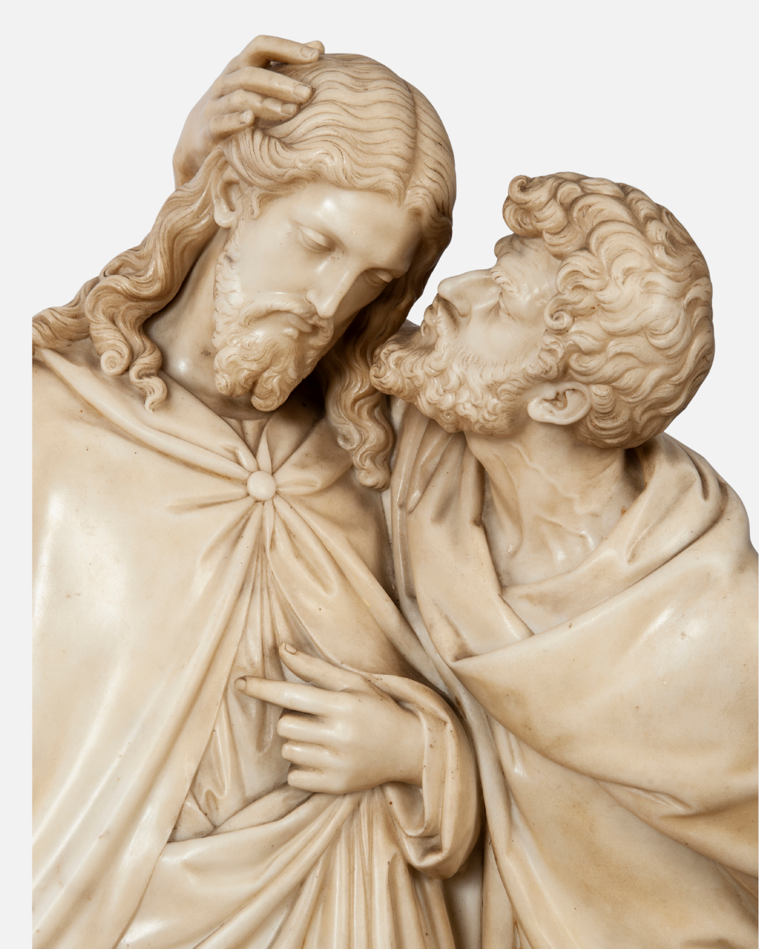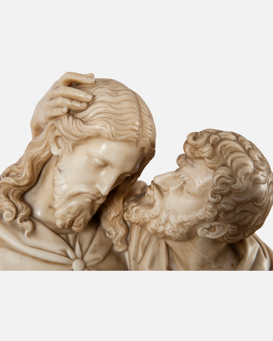Scultura in marmo bianco raffigurante il “Bacio di Giuda”, una simile la ritroviamo presso la Scala Santa in Roma di Jacometti Ignazio; su basamento in legno di forma circolare. Un’opera che cattura un momento drammatico con straordinaria maestria.