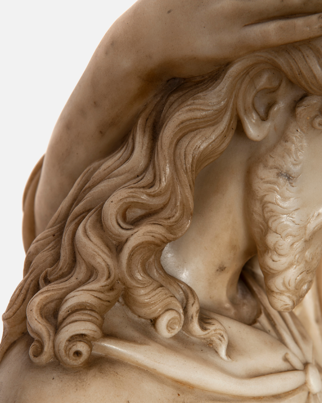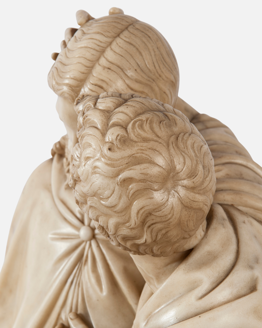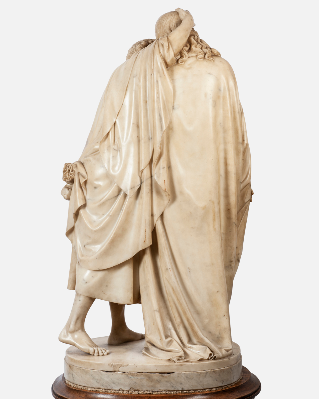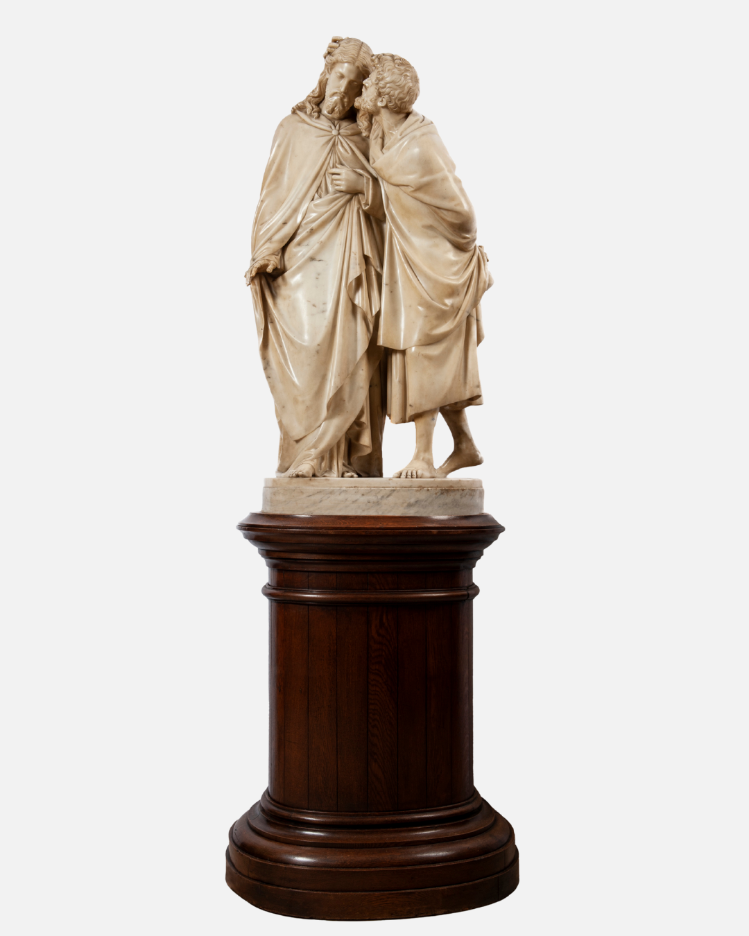 Scultura in marmo bianco raffigurante il “Bacio di Giuda”, una simile la ritroviamo presso la Scala Santa in Roma di Jacometti Ignazio; su basamento in legno di forma circolare. Un’opera che cattura un momento drammatico con straordinaria maestria, evidenziando la tensione e l’emozione del tradimento di Giuda. La scultura, alta 118 cm, è un esempio impressionante della capacità dell’artista di infondere vita e dinamismo nel marmo. Provenienza: Italia.