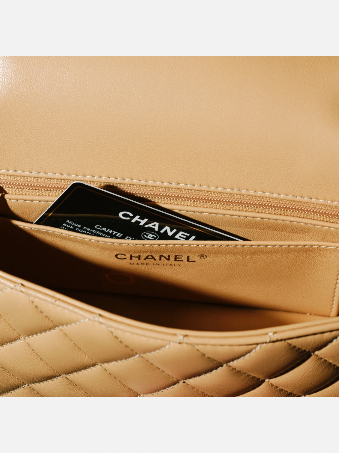 Borsa firmata Chanel, modello mini flap, in pelle di agnello beige trapuntata con hardaware dorato.