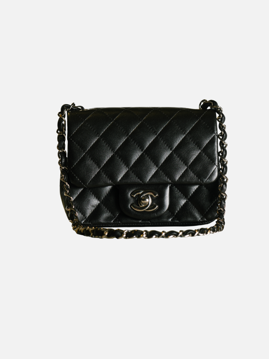 Chanel bag, Timeless line, Square model, made of black quilted lambskin with silver hardware. Twist lock with “CC” logo, inside it is entirely lined in burgundy leather with two comfortable pockets, roomy for essentials. Equipped with a braided leather and chain shoulder strap, the bag can be worn on the shoulder or cross-body. Year of production 2010, the item is in good condition.